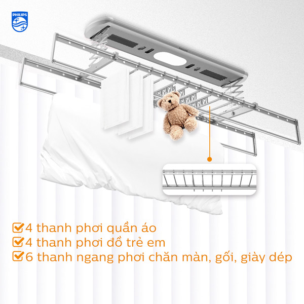 - Philips SDR703-YBW: Trang bị thanh phơi quần áo cố định dài 1.6m, và thanh phơi rút gọn dài 0.8m.