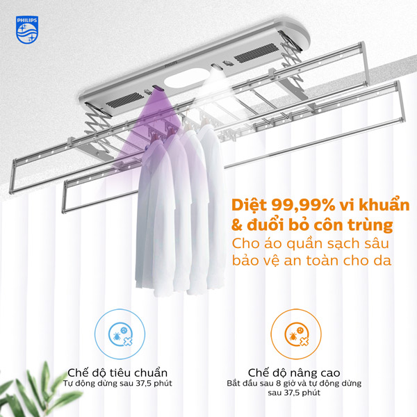 Giàn phơi thông minh Philips SDR703 – Giải pháp phơi đồ toàn diện cho gia đình với khả năng làm khô, làm sạch và giữ cho áo quần phẳng phiu trong mọi điều kiện thời tiết.