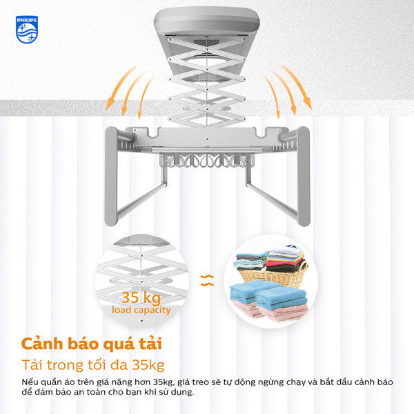 Nếu quần áo trên giá nặng hơn 35kg, giá treo sẽ tự động ngừng chạy và bắt đầu cảnh báo để đảm bảo an toàn cho bạn khi sử dụng.