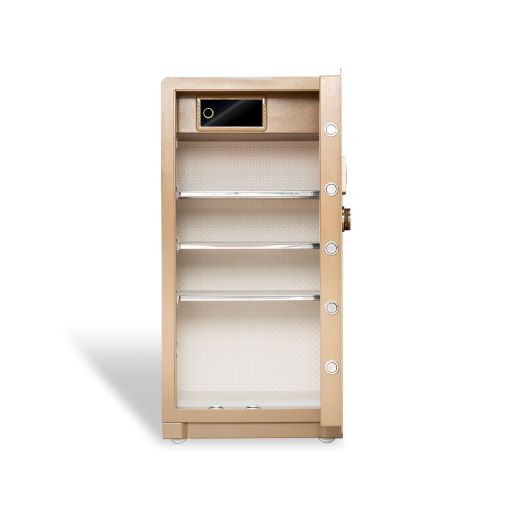 Bề mặt bảng điều khiển điện tử được làm bằng kính cường lực cao cấp. Tay nắm vặn mở két được thiết kế dạng khối hình chữ nhật chắc chắn. Các cạnh viền được mạ vàng khiến két sắt thêm phần sang trọng và tăng độ thẩm mỹ.