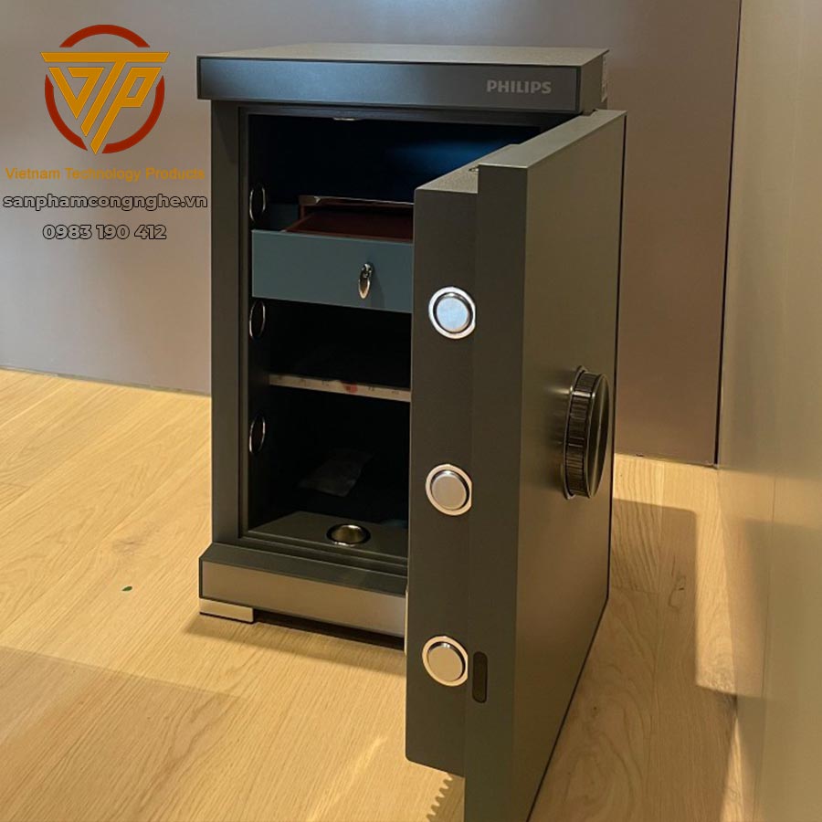 Sản phẩm thiết kế sắc nét với màu sắc Xám và Xám xanh, tạo cảm giác chuyên nghiệp và sang trọng cho người dùng. Két sắt Philips SBX602-7CU có kích thước cao 770mm, rộng 480mm, sâu 430mm và trọng lượng 113kg