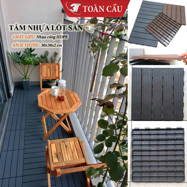 Nếu bạn đang tìm kiếm một loại vật liệu lót sàn tối ưu về chi phí và tính thẩm mĩ thì tại sao không thử lựa chọn tấm nhựa lót sàn ban công 3T-HDPE 2cm (Seri 3TTO.SN016X). Đây là một sự lựa chọn hoàn hảo: Chống trơn trợt, không hấp thụ tia cực tím, không thấm nước, Chịu lực cực tốt, Bền màu, hoàn toàn an toàn và thân thiện với môi trường là lựa chọn tuyệt hảo cho các ban công, hồ bơi, nhà vệ sinh, sân vườn, Phòng khách.